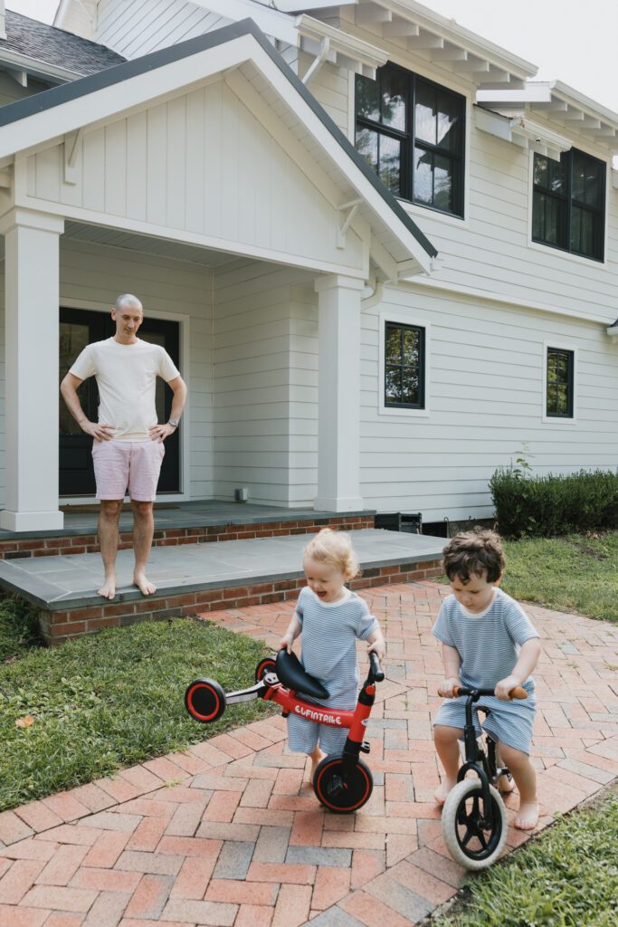 My approach is always to keep the session rolling and let kids call some of the shots. Instead of forcing perfect poses, we capture their personalities and genuine expressions by incorporating things they love. This included sitting on Dad’s shoulders, driving a toy car on Dad’s head, and riding their bikes down the new front walkway.